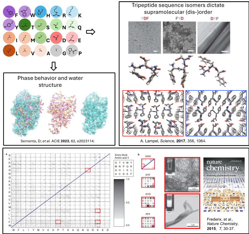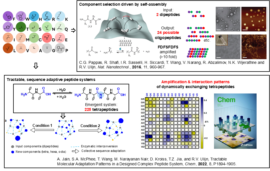Living systems provide the most sophisticated materials known. These materials and systems are created from a fully conserved set of just a few dozen building blocks common to all life forms. This observation begs a profound question: why can’t everything, including things that life has not explored, be made from biological building blocks? The Ulijn lab is taking steps to making this vision a reality, not by copying biology, but by developing methodology for bottom-up design, discovery and evolution of functional materials and biofluids to redesign biomolecules for a variety of applications.1 Some ongoing research projects: (i) Design of peptide modalities that give rise to formation of liquid condensates,2, 3 (ii) Mechano-responsive peptide crystals;4 (iii) Drug-matched peptide nanoparticles; (iv) Experimental learning and memory using sequence-adaptive peptide mixtures.5,6 Overall, our research demonstrates that peptides, and dynamically exchanging mixtures of peptides, show significant potential as designable and tunable nanomaterials for a variety of applications in biomedicine and green nanotechnology.
