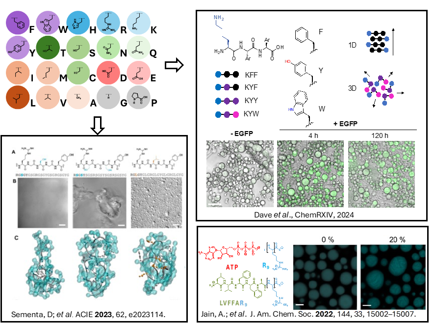 Condensate-based peptide systems promise opportunities to compartmentalize or segregate reactions and to gain precise (spatial and temporal) regulatory control over biomolecular processes in cells and test tubes. Our aim is to figure out the design rules to create liquid peptide materials with , including (i) controlled sequestering of fibers and molecules inside coacervates, resulting in unique architectures of liquid droplets with solid fiber networks, (ii) design and experimental and computational characterization of a series of new peptide modalities for liquid-liquid phase separation, which also reveal new fundamental insights into the role of backbone structuring; (iii) discovery of unique two- stage liquid-liquid-solid phase separation to achieve effective encapsulation upon drying.