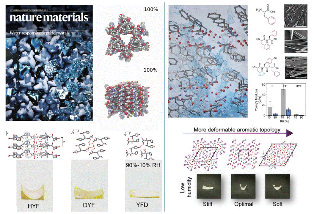 Some materials can undergo reversible structural changes in response to changes in their environment, including relative humidity, e.g. due to evaporation. These water-responsive materials directly convert evaporation energy into mechanical energy and hold great potential as actuators for soft robotics, self-powered devices, and electromagnetic generators. We use short peptides as building blocks to uncover design principles that enhance chemo-mechanical responsiveness. Our design draws inspiration from biological systems, leveraging reconfigurable protein side chains, and employs crystal engineering principles to produce cost-effective, biocompatible, and environmentally friendly actuators.
